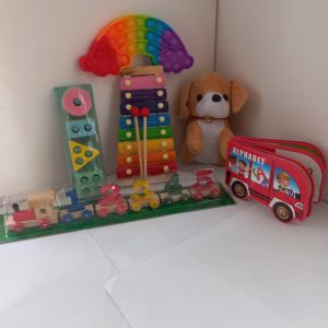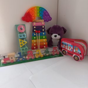 Limited Offer Infant Educational Combo includes 1x Plush Teddy bear, 1x 8note Xylophone, 1x lFidget popper, 1x Foam Alphabet book, 1x 4 Block sorter, 1x magnetic numbers train. Suitable for 6months to 3yrs.